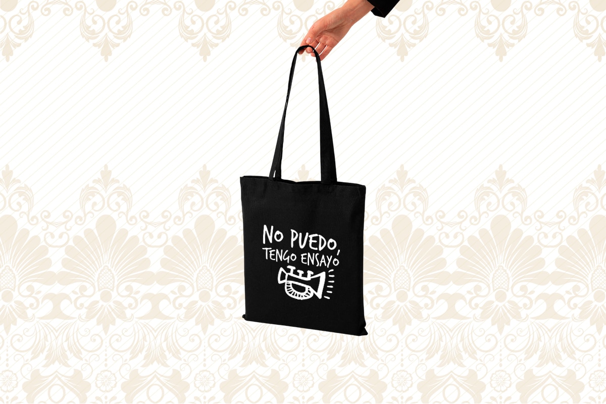Esta bolsa de tela negra con diseño exclusivo es un guiño a los que viven la música cofrade todo el año. Ligera, práctica y con carácter. Ideal para ir al ensayo, a la facultad o a por el pan, dejando claro que tus prioridades están clarísimas.