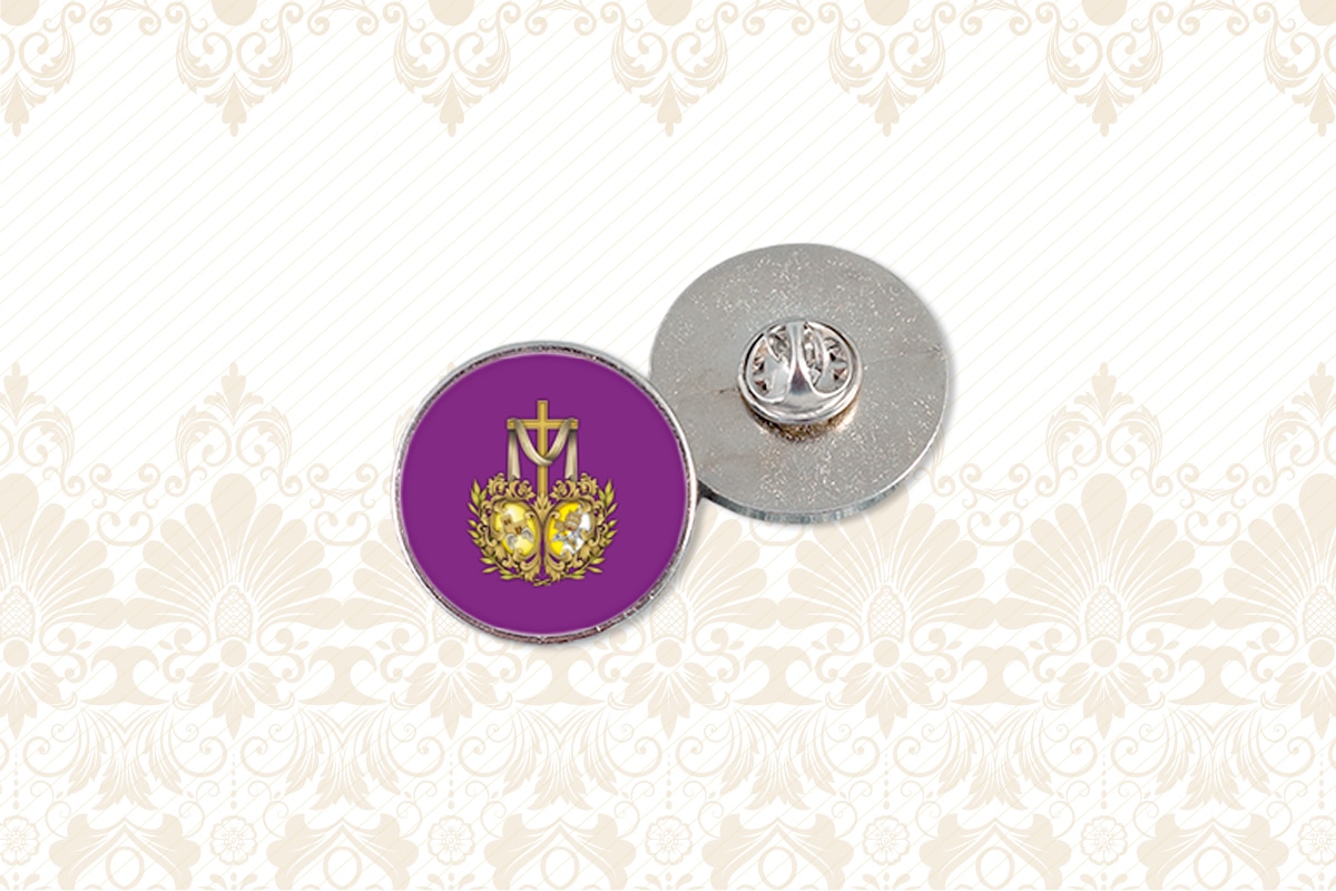 Este pin metálico de 25 mm es un detalle con carácter cofrade, pensado para lucirse con mayor presencia en la solapa, la mochila o incluso en prendas más informales. De formato redondo y gran tamaño, permite que el diseño destaque aún más, ideal para quienes buscan una opción visible pero elegante.